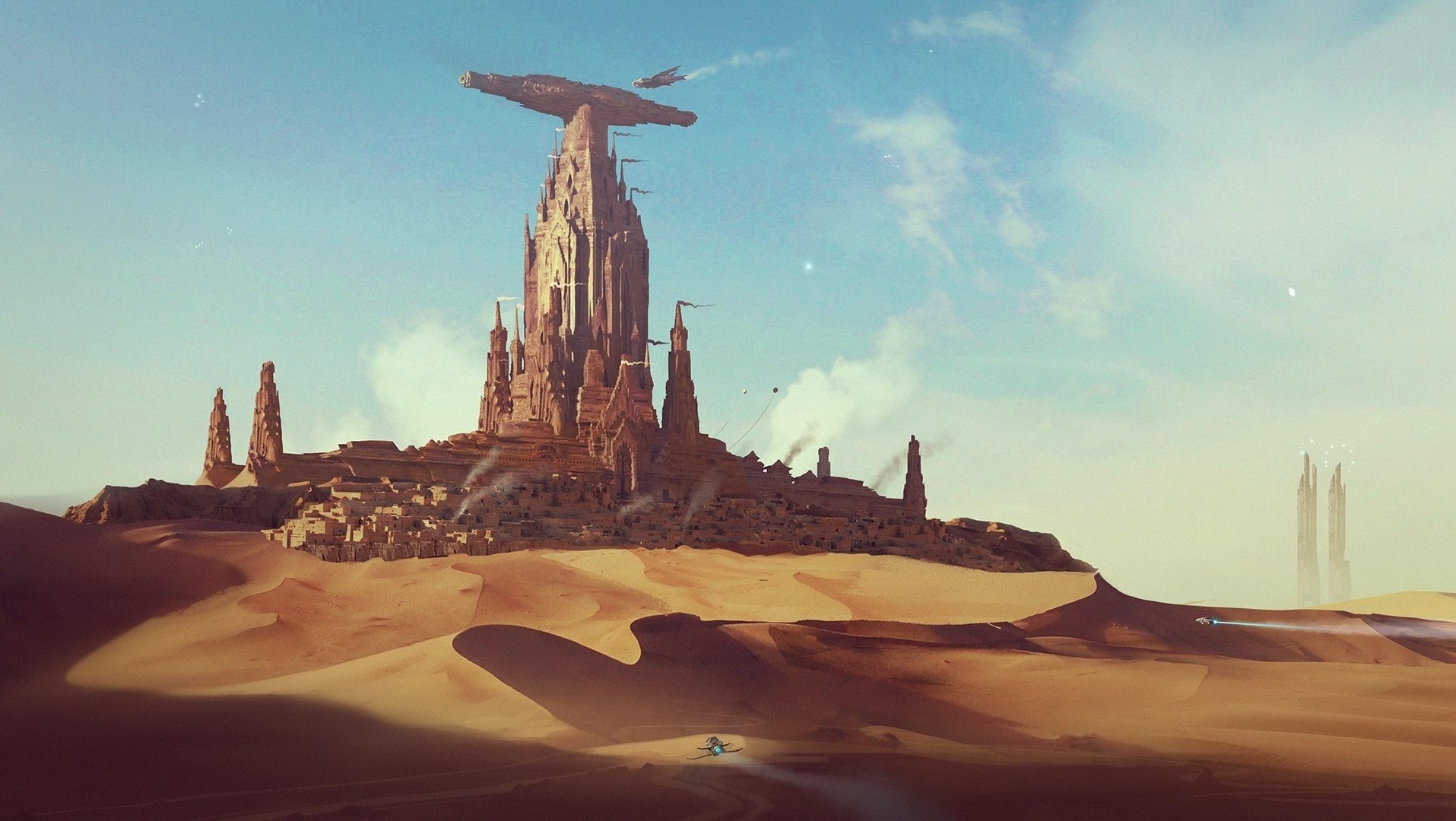 Images show a mix of Star Wars-esque landscapes with a twist – such as the towering medieval-like space castle on a Tatooine-like desert planet, or a gritty futuristic skyline covered in the smog from two giant cooling towers.